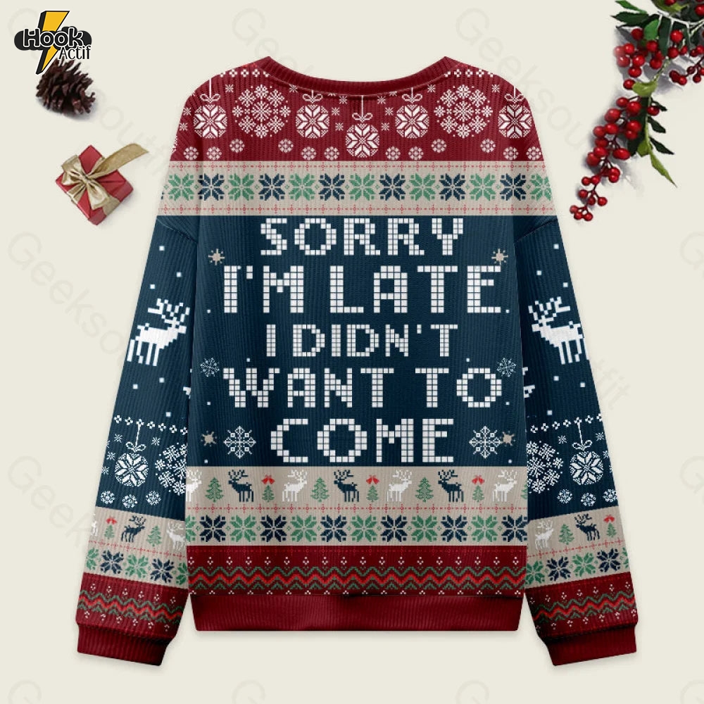 Product Picture: Sorry I’m Late. I didn’t Want to Come Red and Blue Ugly Christmas Fuzzy Fleece Sweatshirt
