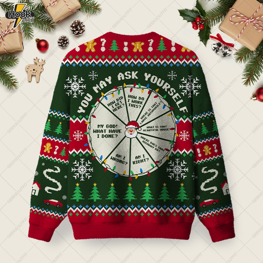 The You May Ask Yourself Ugly Christmas Fuzzy Fleece Sweatshirt is the ultimate festive apparel for holiday gatherings. With its cozy fleece material and playful design, it guarantees warmth and style during winter celebrations. Perfect for Christmas parties, family gatherings, or even cozy nights in, this sweatshirt is a must-have. Embrace the holiday spirit with the You May Ask Yourself Ugly Christmas Fuzzy Fleece Sweatshirt!